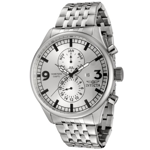 The refined Invicta Men's II Collection Watch features a modern style with two centered subdials. The round, silver-toned stainless steel case and bezel are brushed and polished for a sleek smooth look. A silver dial gracefully displays black Arabic numerals at the three and nine o'clock hours and rectangular black indices at all other hour positions. Other features of this timepiece include a date window near the three o'clock position, black luminous hour, minute, and second hands, and two subdials displayed vertically at the center of the dial, the top subdial features the month, and the bottom subdial displays 24-hour time. The brushed-and-polished silver-toned stainless steel band securely fastens by fold-over clasp and double push-button safety. This timepiece offers Swiss quartz movement and is protected by a flame-fusion crystal. The watch is water resistant to a depth of 330 feet (100 meters).II Collection